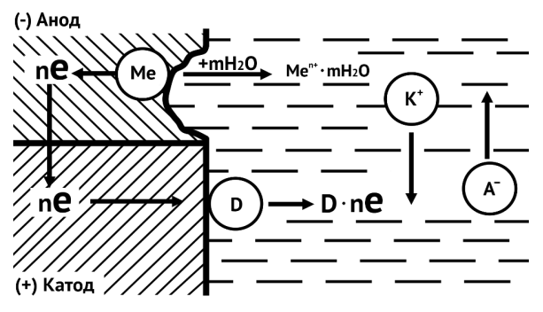 3. процесс движения электронов в металле от анодных участков к катодным и перемещение катионов и анионов в растворе.