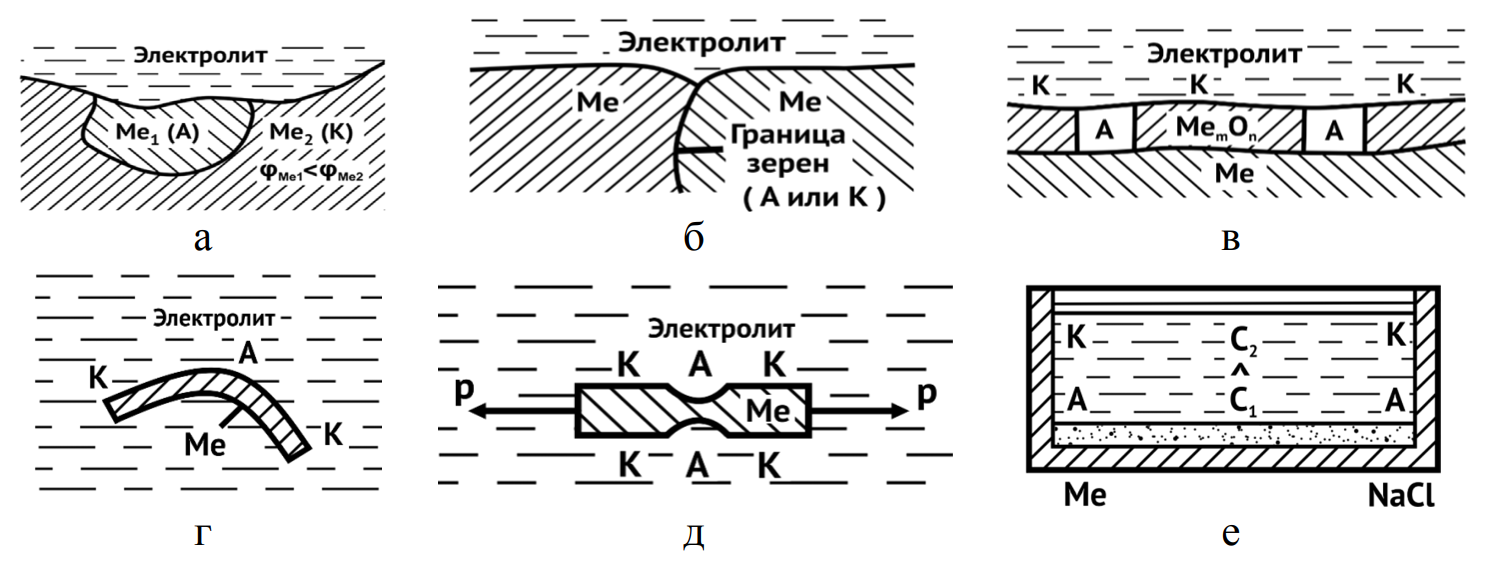 На практике чаще всего приходится иметь дело с элементами третьего типа. Возникновение коррозионных элементов происходит не только при контакте разнородных металлов, но и при воздействии электролита на один и тот же металл, отличающийся на различных участках физической или химической неоднородностью.